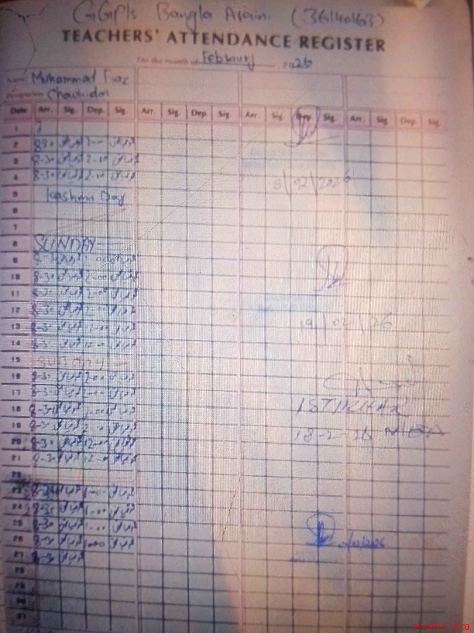 | Monitoring Date: 27-02-2026 | Start Time: 27-02-2026 09:51 AM | End Time: 27-02-2026 10:01 AM | Name of MEA: Mu**** Il**** | |