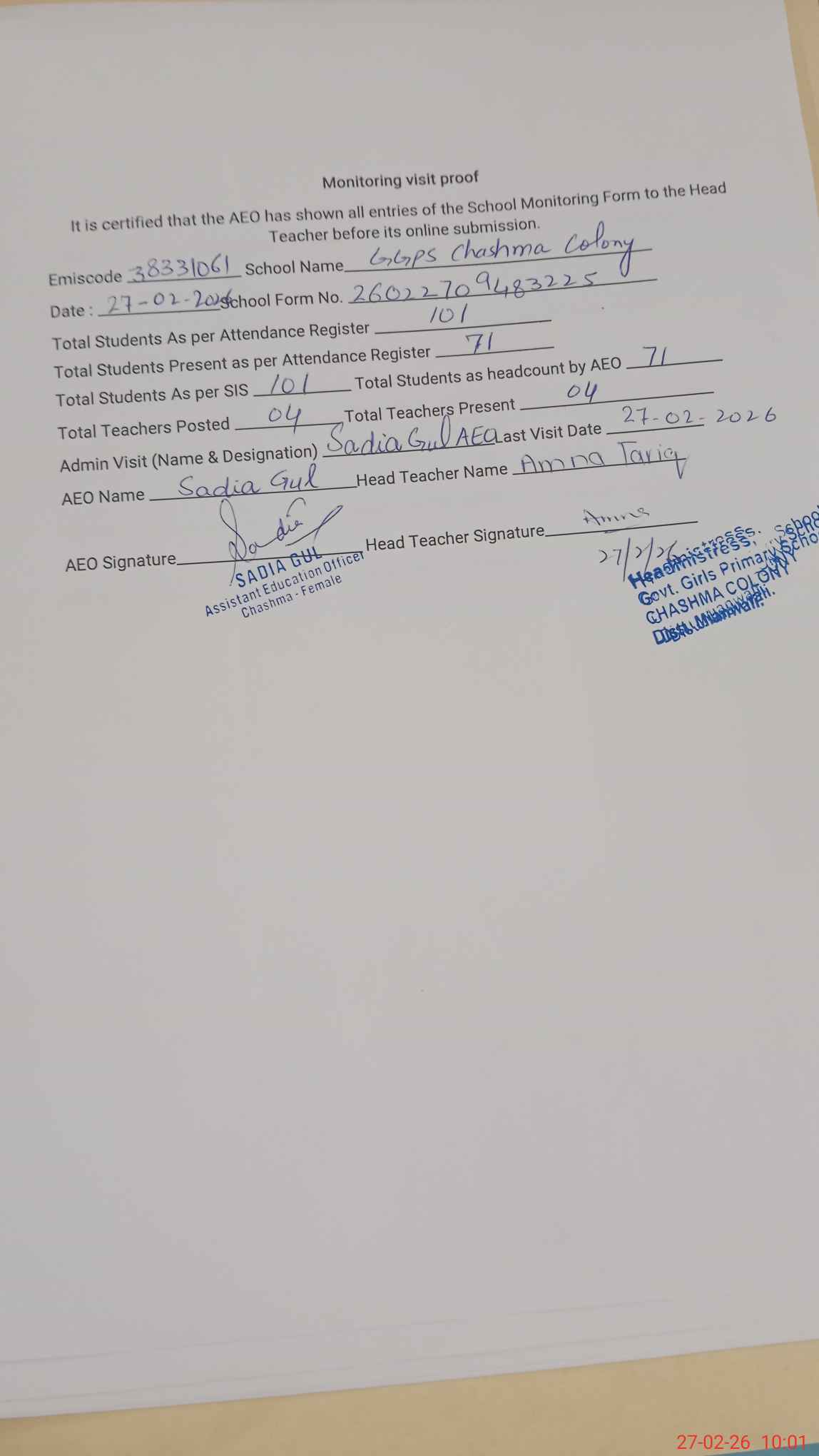 | Attendance Register | Head Teacher | MEA with School | Visit Proof |