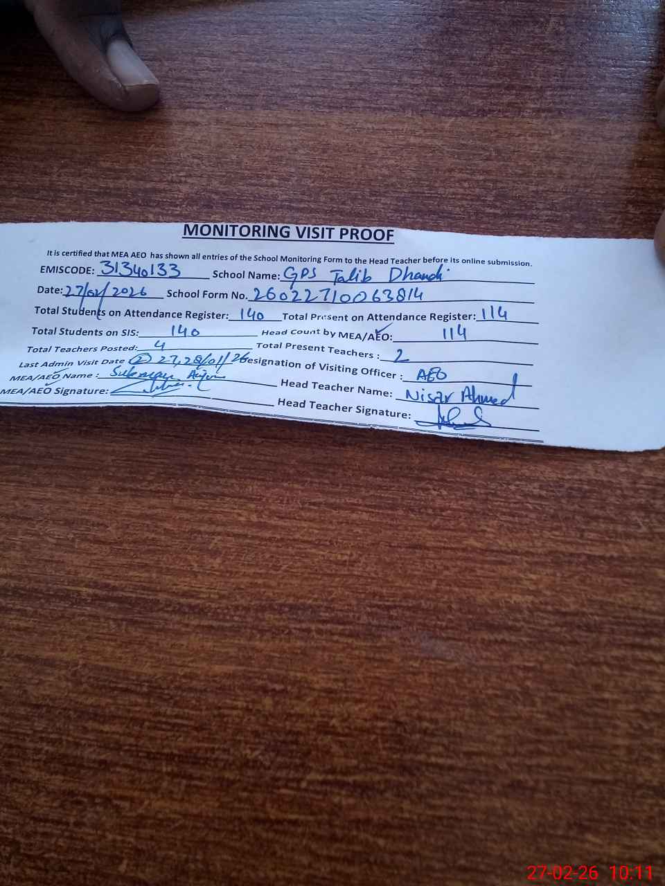 | Attendance Register | Head Teacher | MEA with School | Visit Proof |