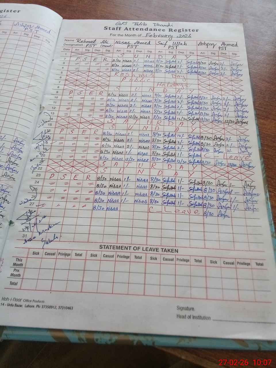| CNIC | Full Name | Designation | R/C | Absence During Last Calender Month |
