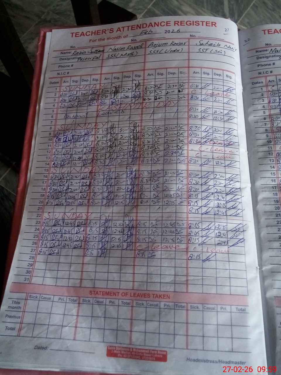 | CNIC | Full Name | Designation | R/C | Absence During Last Calender Month |