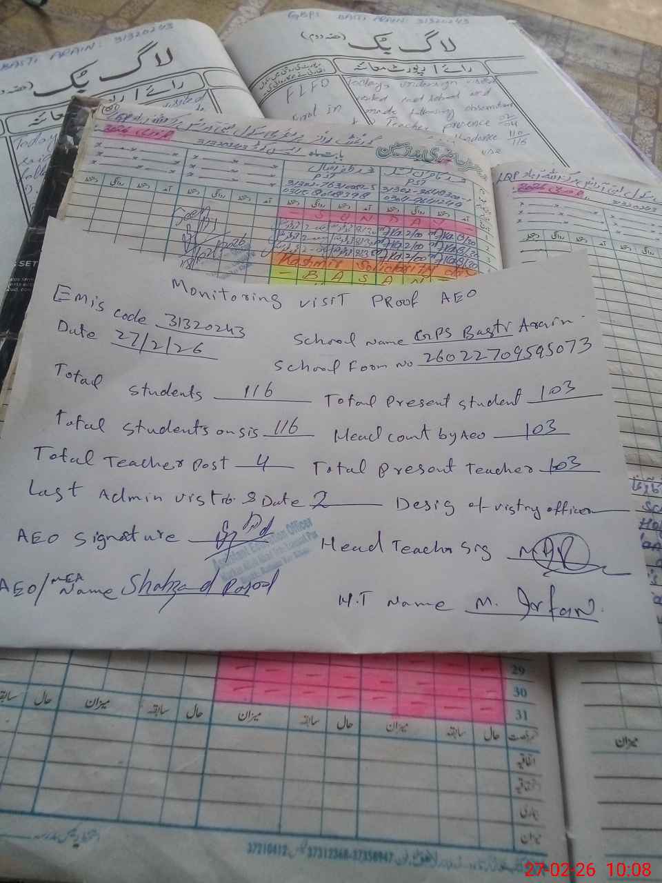 | Attendance Register | Head Teacher | MEA with School | Visit Proof |