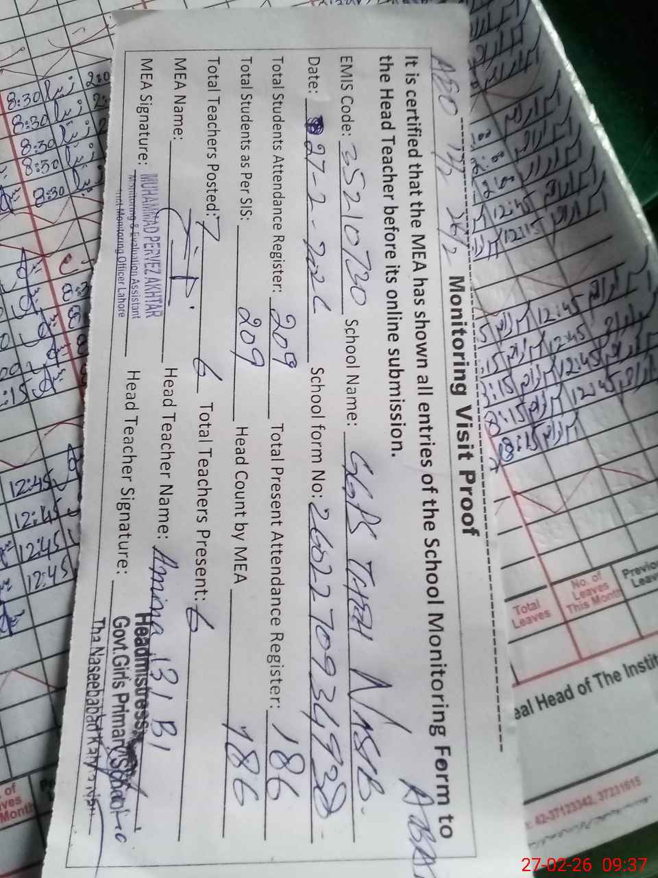 | Attendance Register | Head Teacher | MEA with School | Visit Proof |