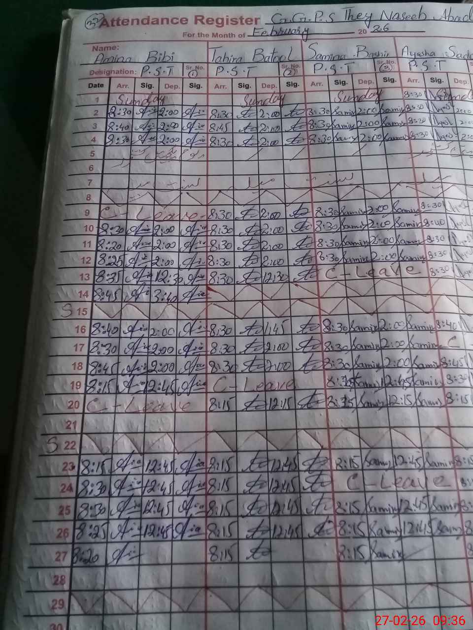 | CNIC | Full Name | Designation | R/C | Absence During Last Calender Month |