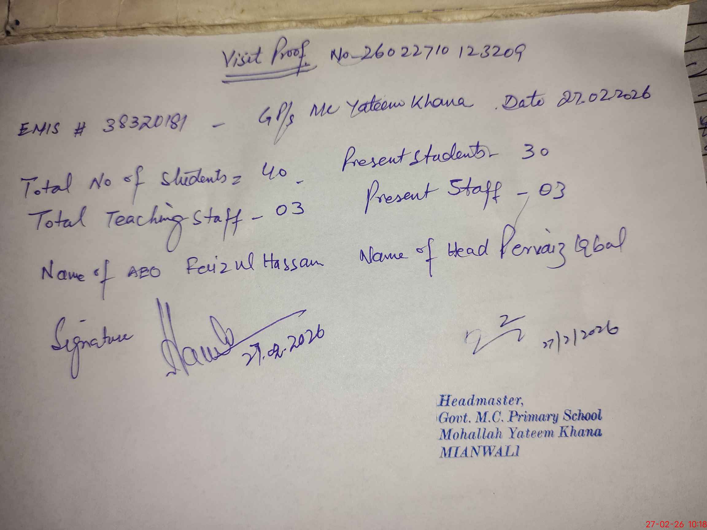 | Attendance Register | Head Teacher | MEA with School | Visit Proof |