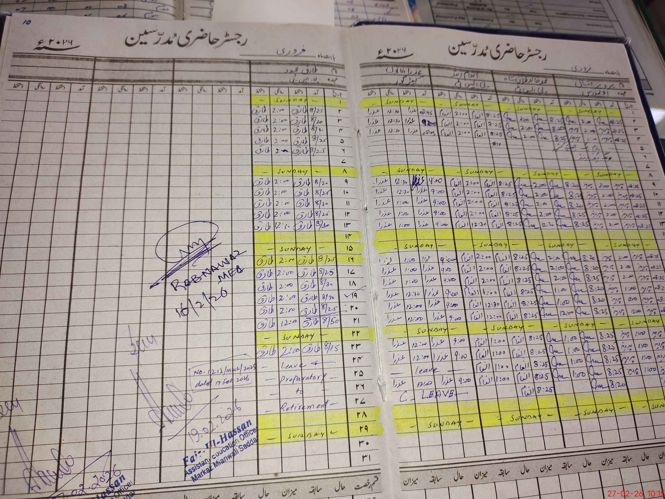| CNIC | Full Name | Designation | R/C | Absence During Last Calender Month |