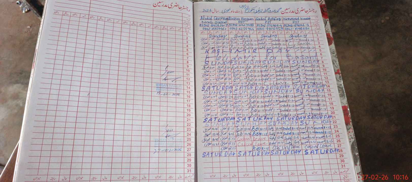 | Leave | Duty | Absent | Maternity | Medical | Ex- Pak |