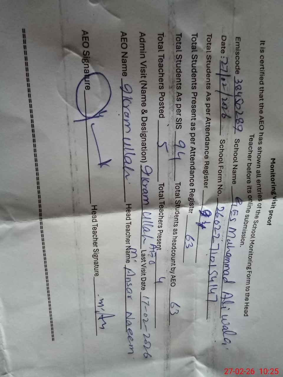 | Certified that this School was Inspected by the Undersigned MEA/DMO Today and the Information Stated Above is as Per Record. | |||||