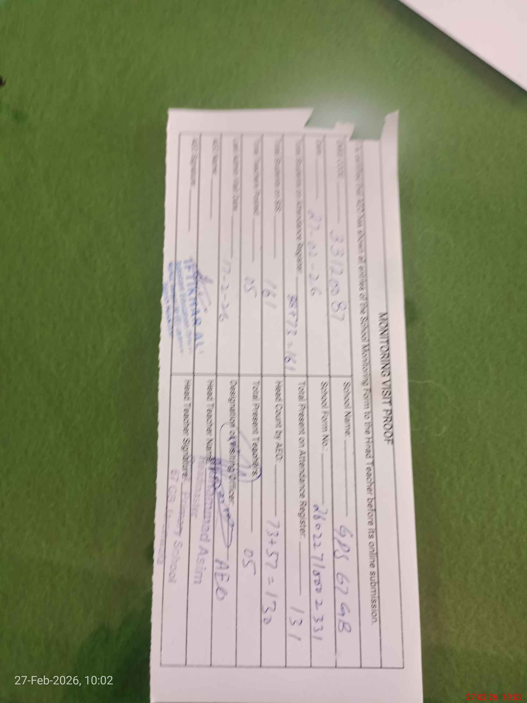 | Monitoring Date: 27-02-2026 | Start Time: 27-02-2026 09:17 AM | End Time: 27-02-2026 10:02 AM | Name of MEA: If**** Al**** | |