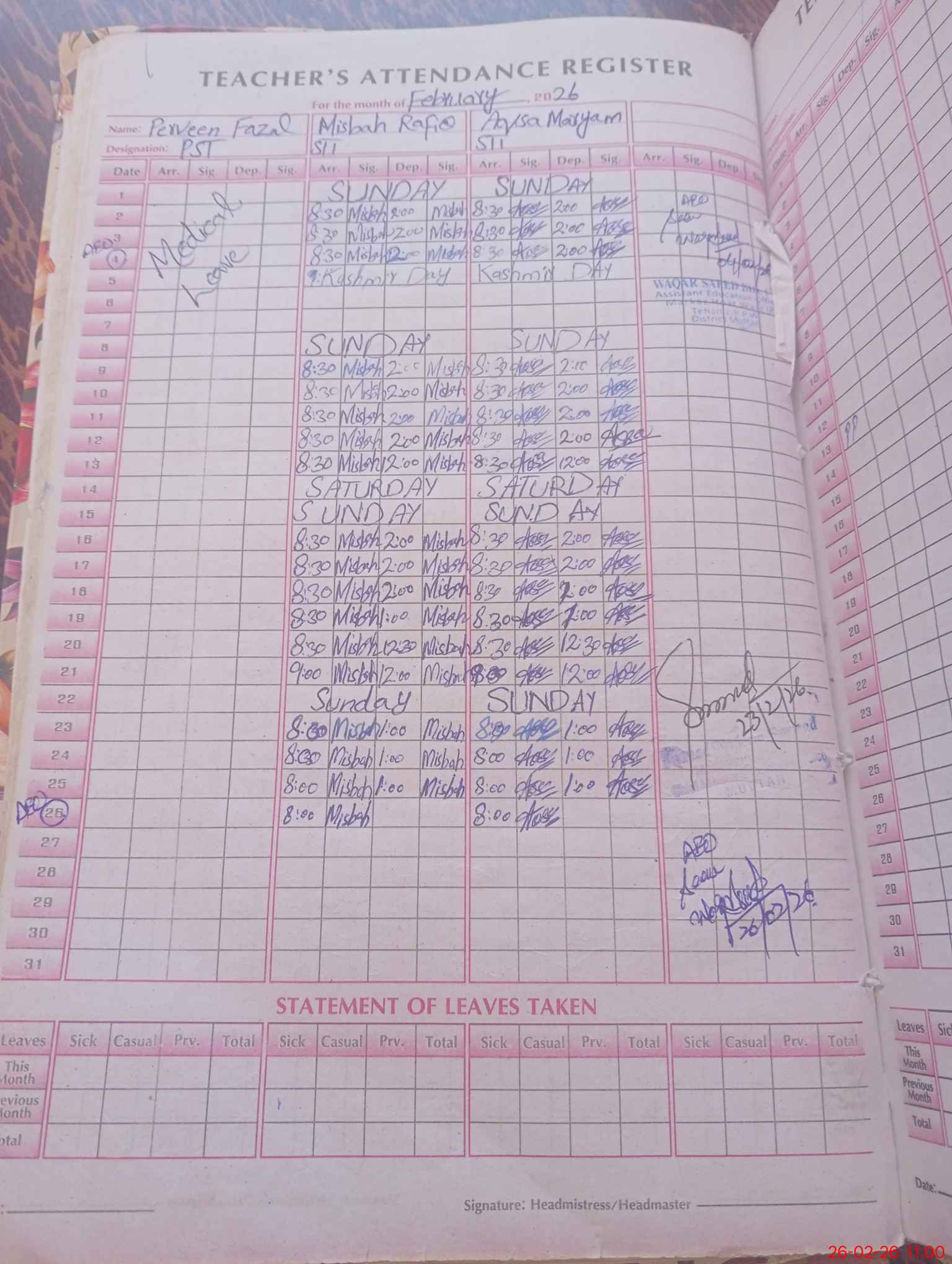 | Leave | Duty | Absent | Maternity | Medical | Ex- Pak |