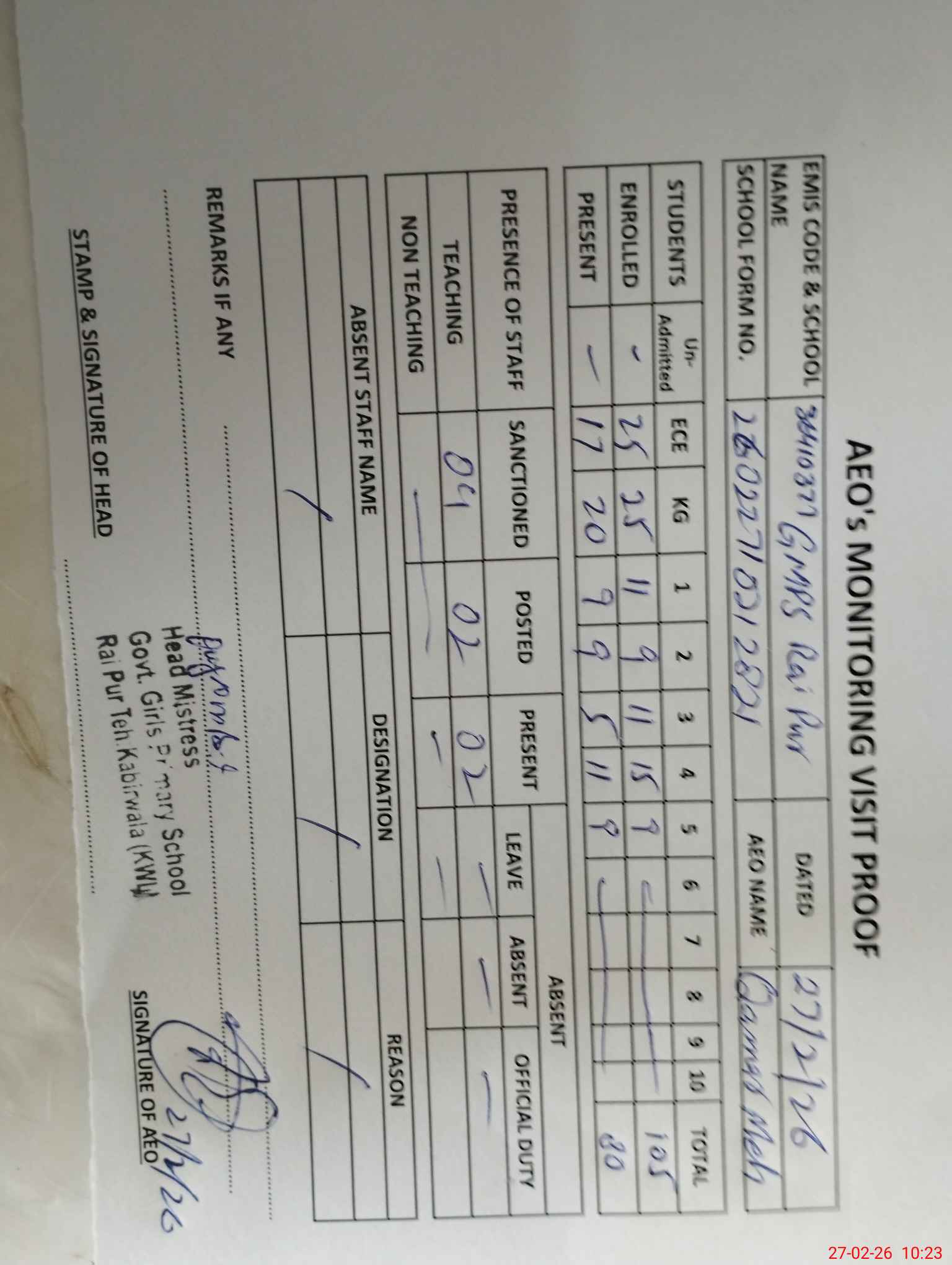 | EMIS Code: 36410377 | Name of School: GMPS RAI PUR, KABIRWALA | |||