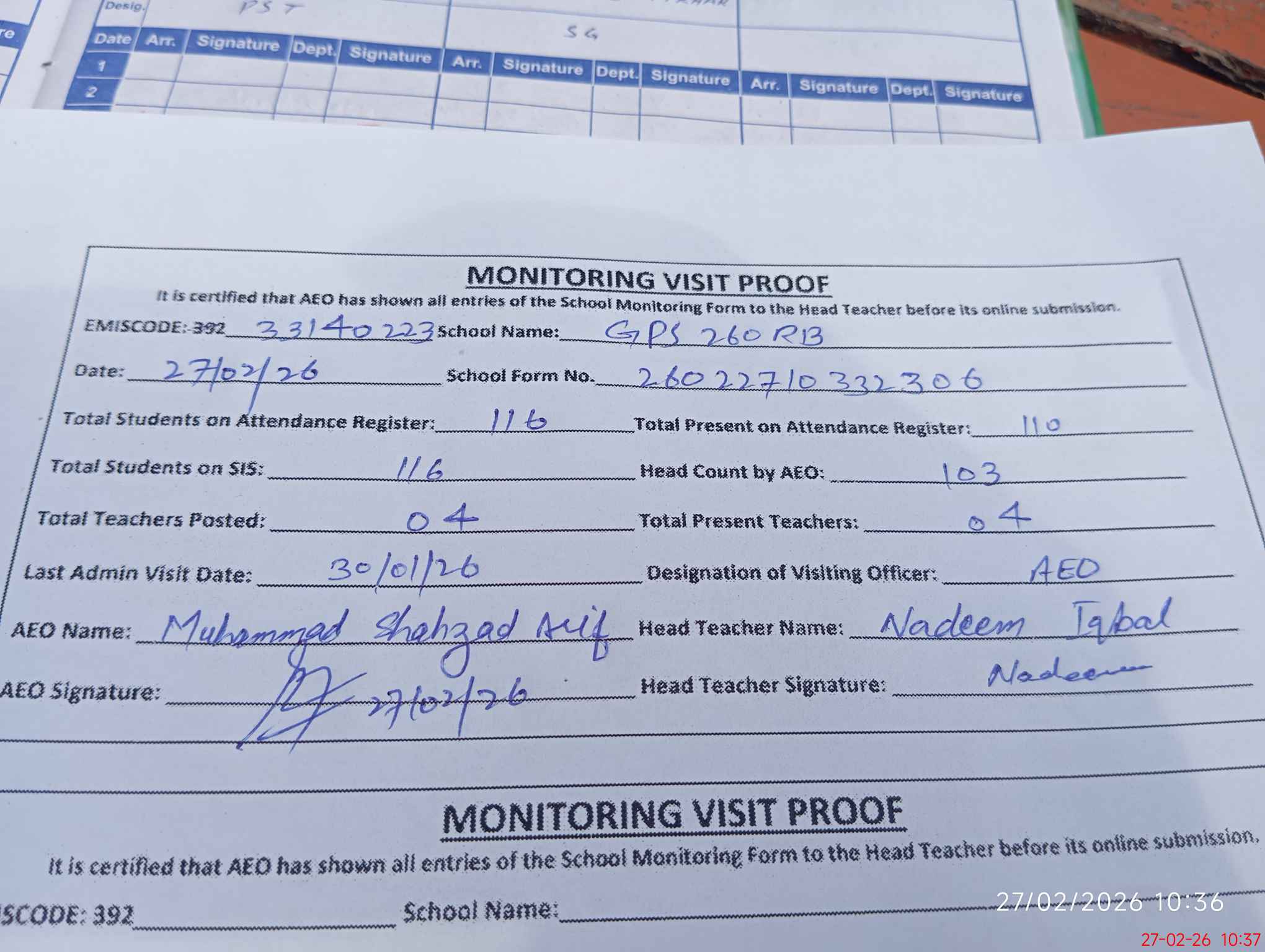 | Attendance Register | Head Teacher | MEA with School | Visit Proof |