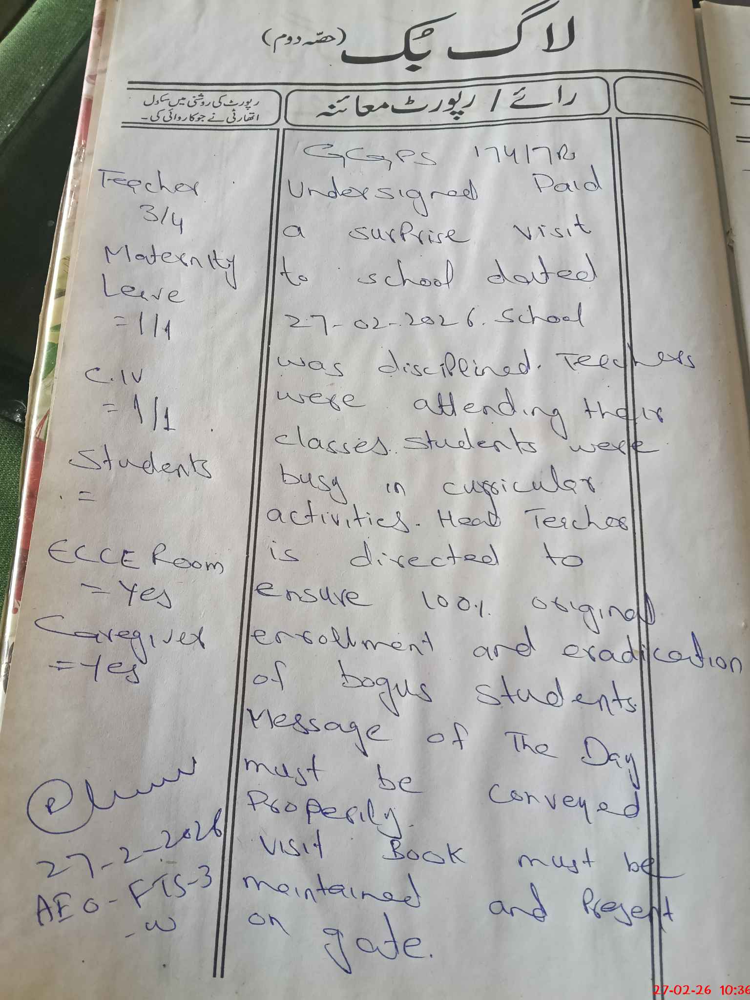 | Attendance Register | Head Teacher | MEA with School | Visit Proof |