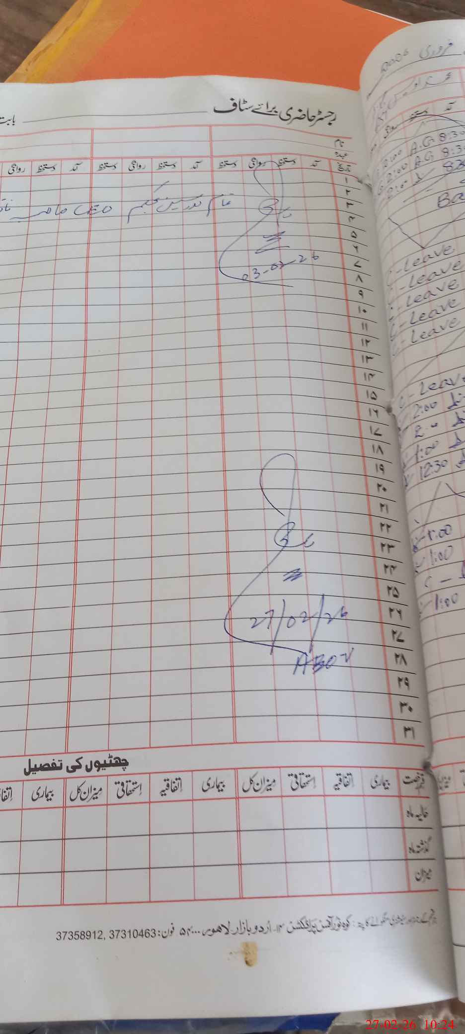 | CNIC | Full Name | Designation | R/C | Absence During Last Calender Month |
