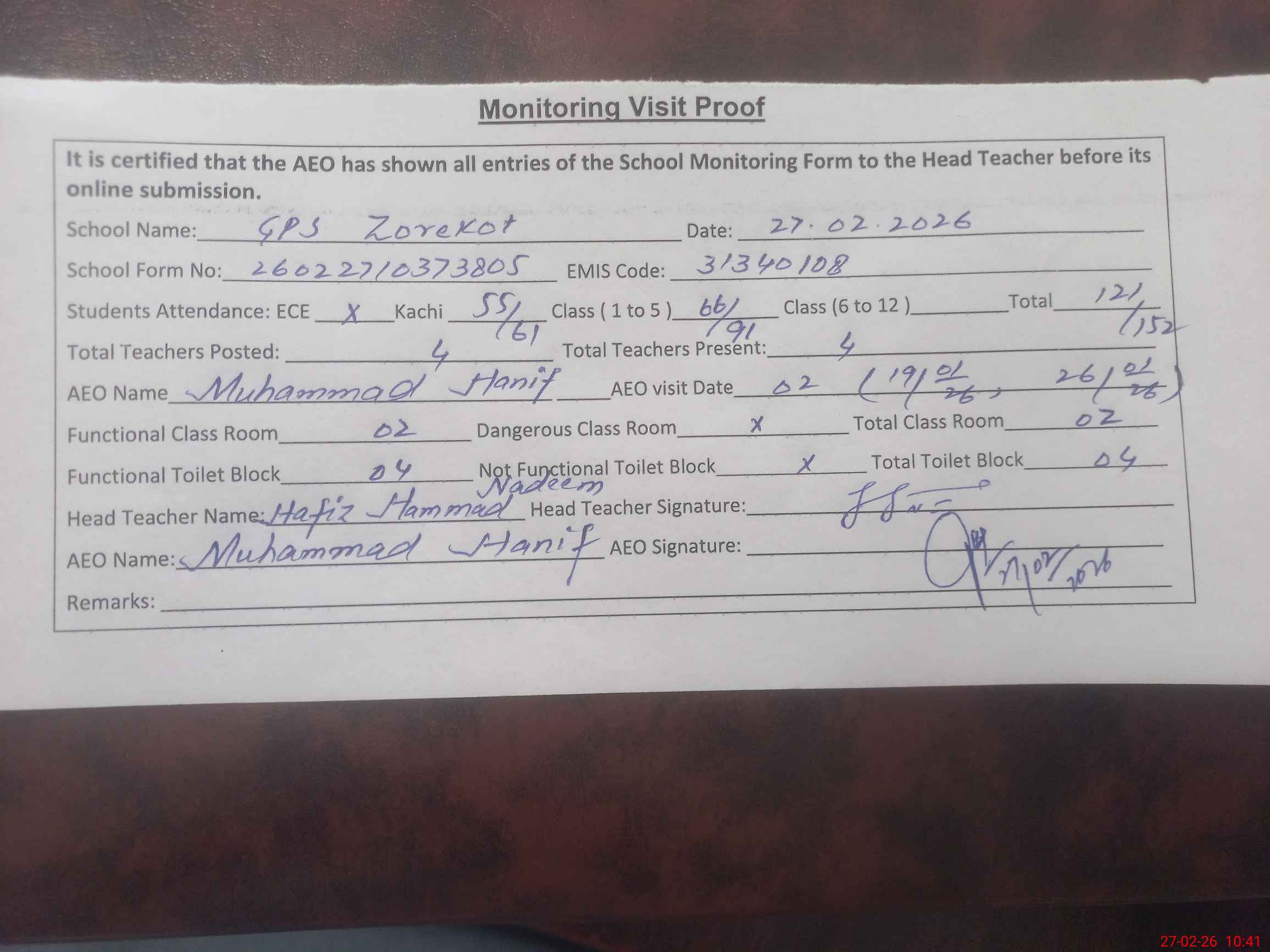 | Attendance Register | Head Teacher | MEA with School | Visit Proof |