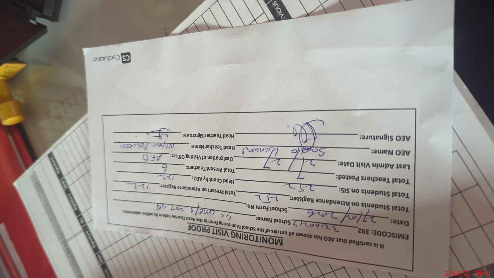 | Attendance Register | Head Teacher | MEA with School | Visit Proof |