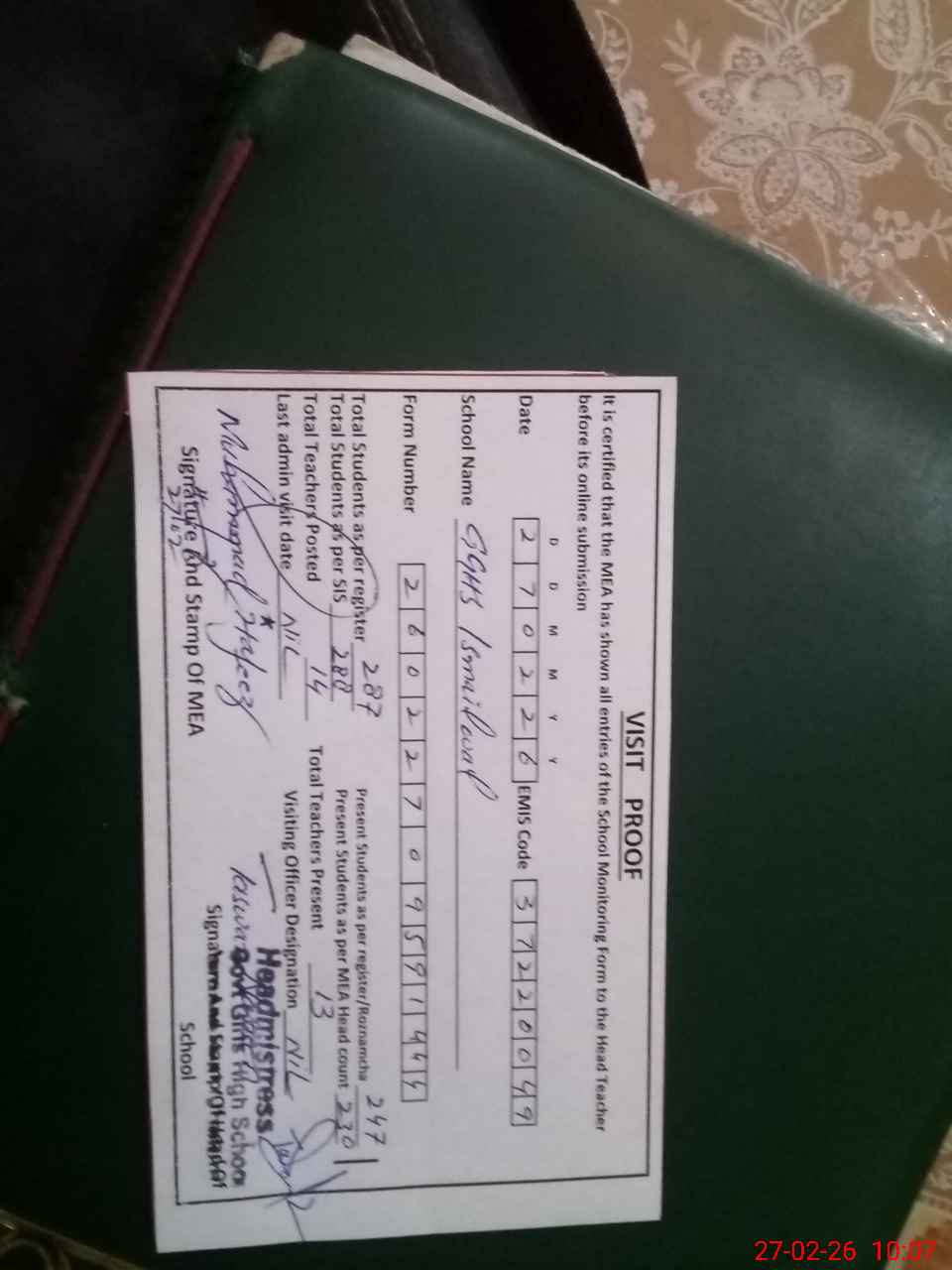 | Certified that this School was Inspected by the Undersigned MEA/DMO Today and the Information Stated Above is as Per Record. | |||||