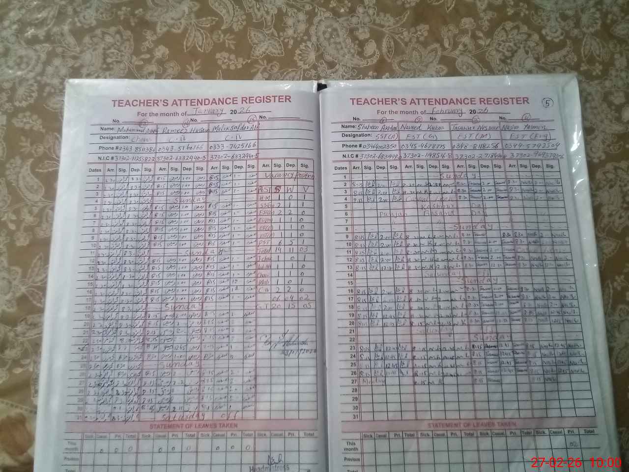 | CNIC | Full Name | Designation | R/C | Absence During Last Calender Month |