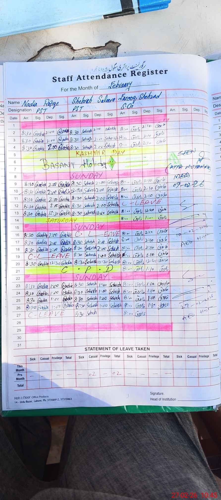 | CNIC | Full Name | Designation | R/C | Absence During Last Calender Month |