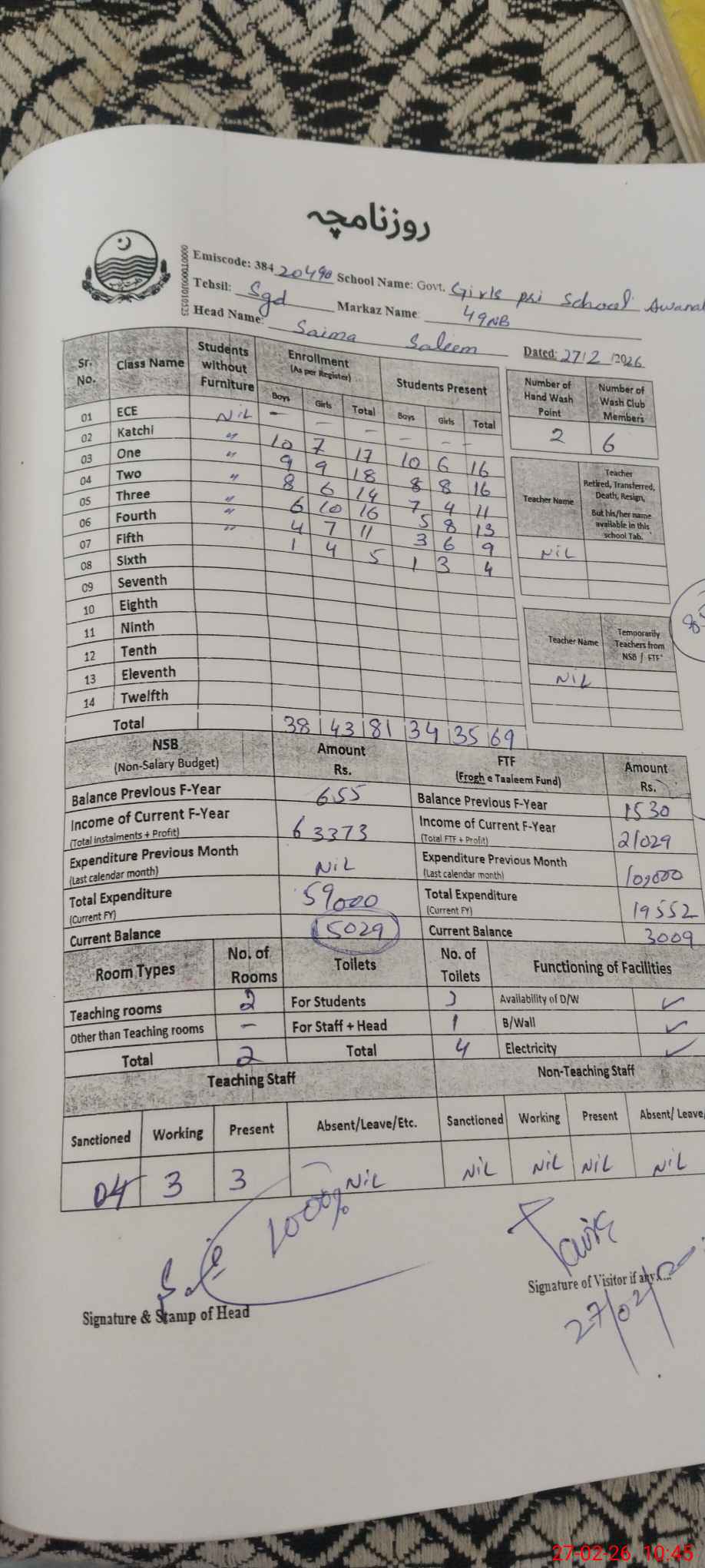| District: SARGODHA | Tehsil: SARGODHA | Markaz: 49-NB - FEMALE | Level: Primary | |