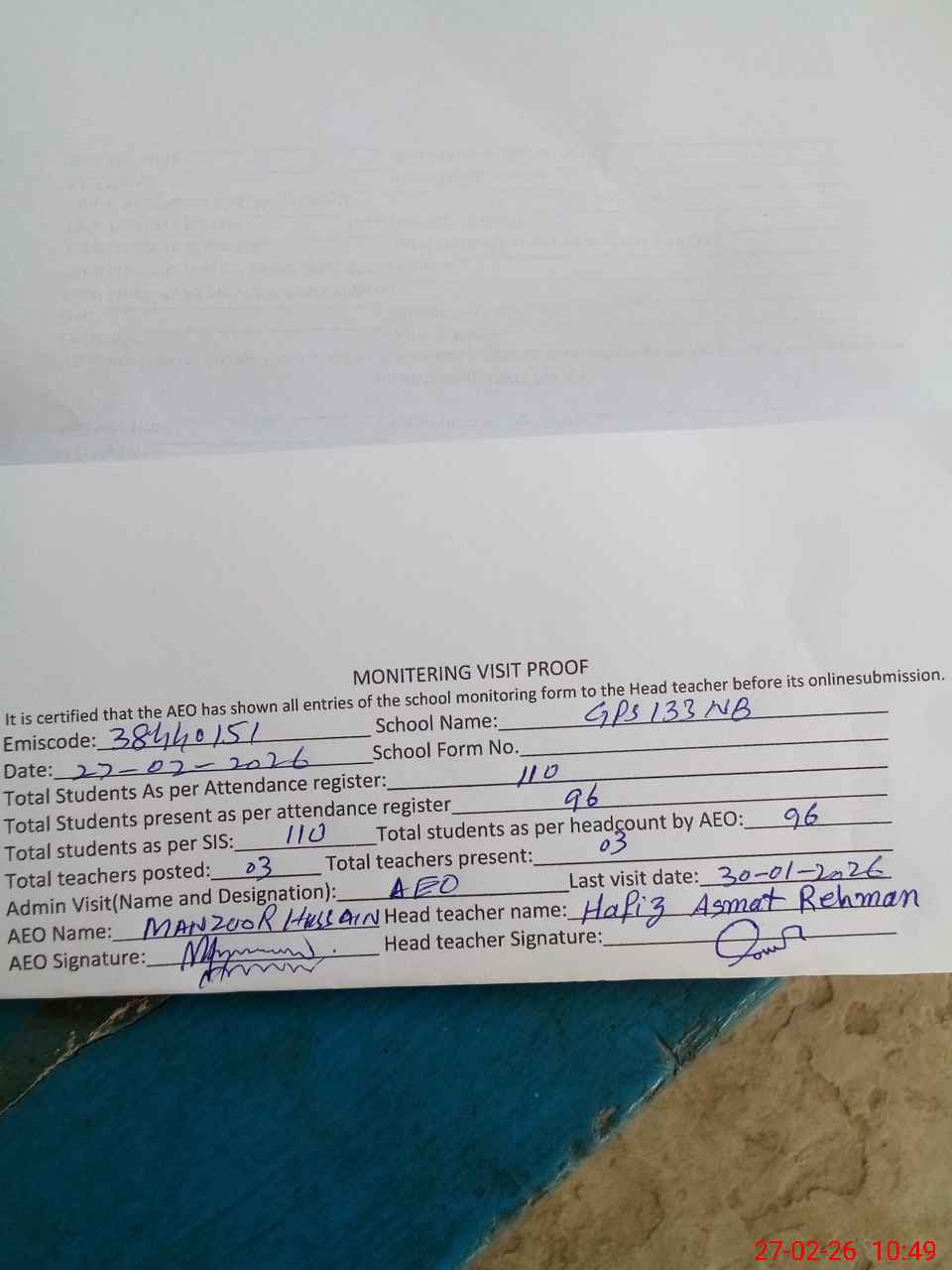 | Monitoring Date: 27-02-2026 | Start Time: 27-02-2026 10:09 AM | End Time: 27-02-2026 10:49 AM | Name of MEA: Ma**** Hu**** | |