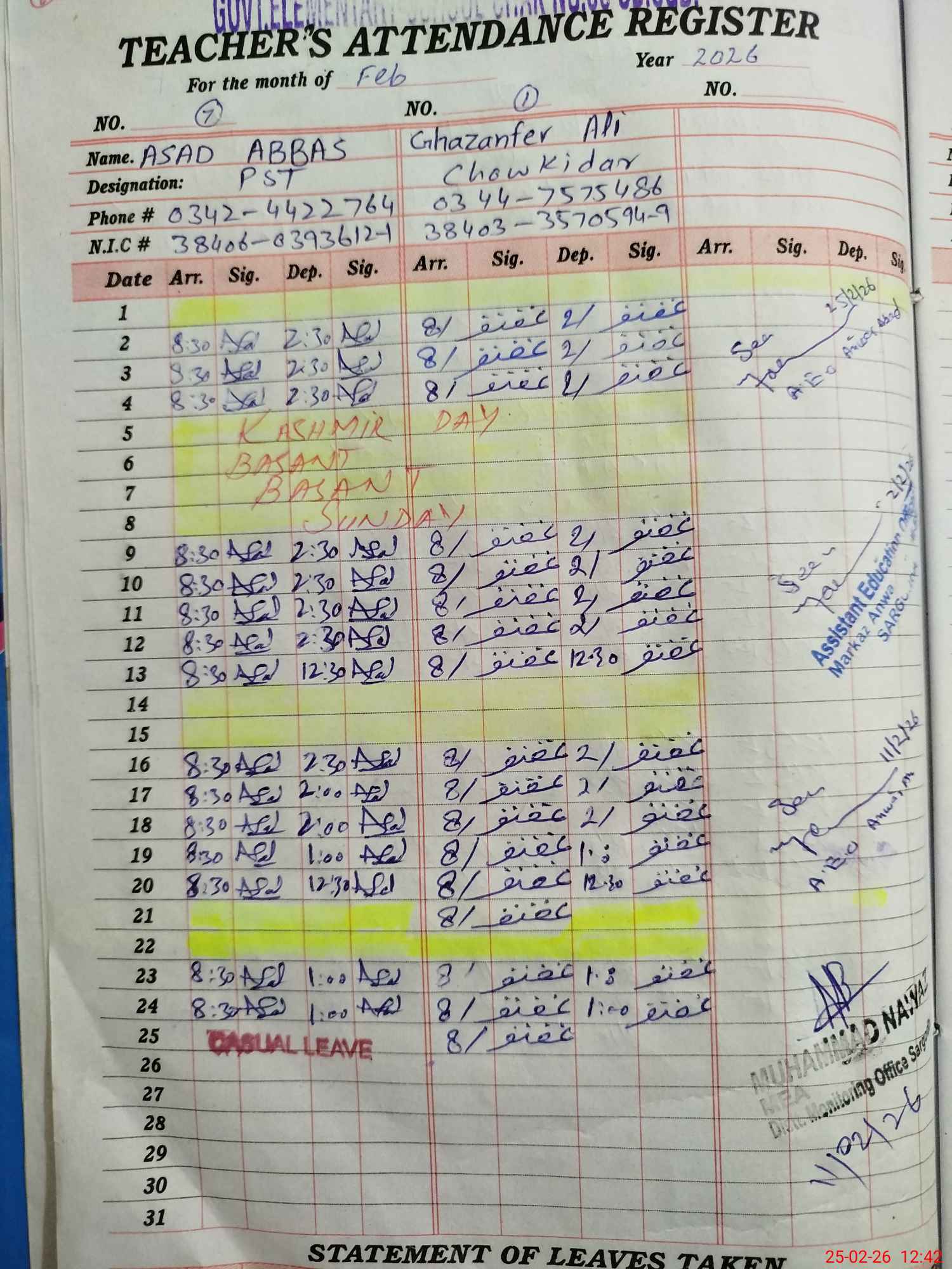 | CNIC | Full Name | Designation | R/C | Absence during last cal. month |