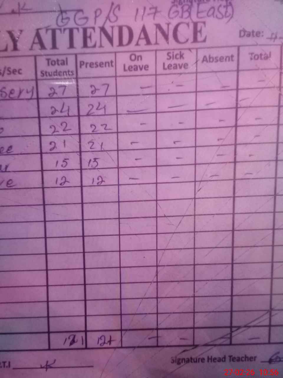 | Total Students Present | 0 | 0 | 24 | 22 | 21 | 15 | 12 | 121 | ||||||||