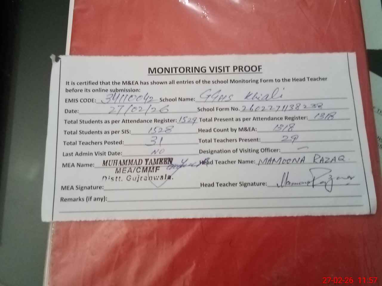 | Attendance Register | Head Teacher | MEA with School | Visit Proof |