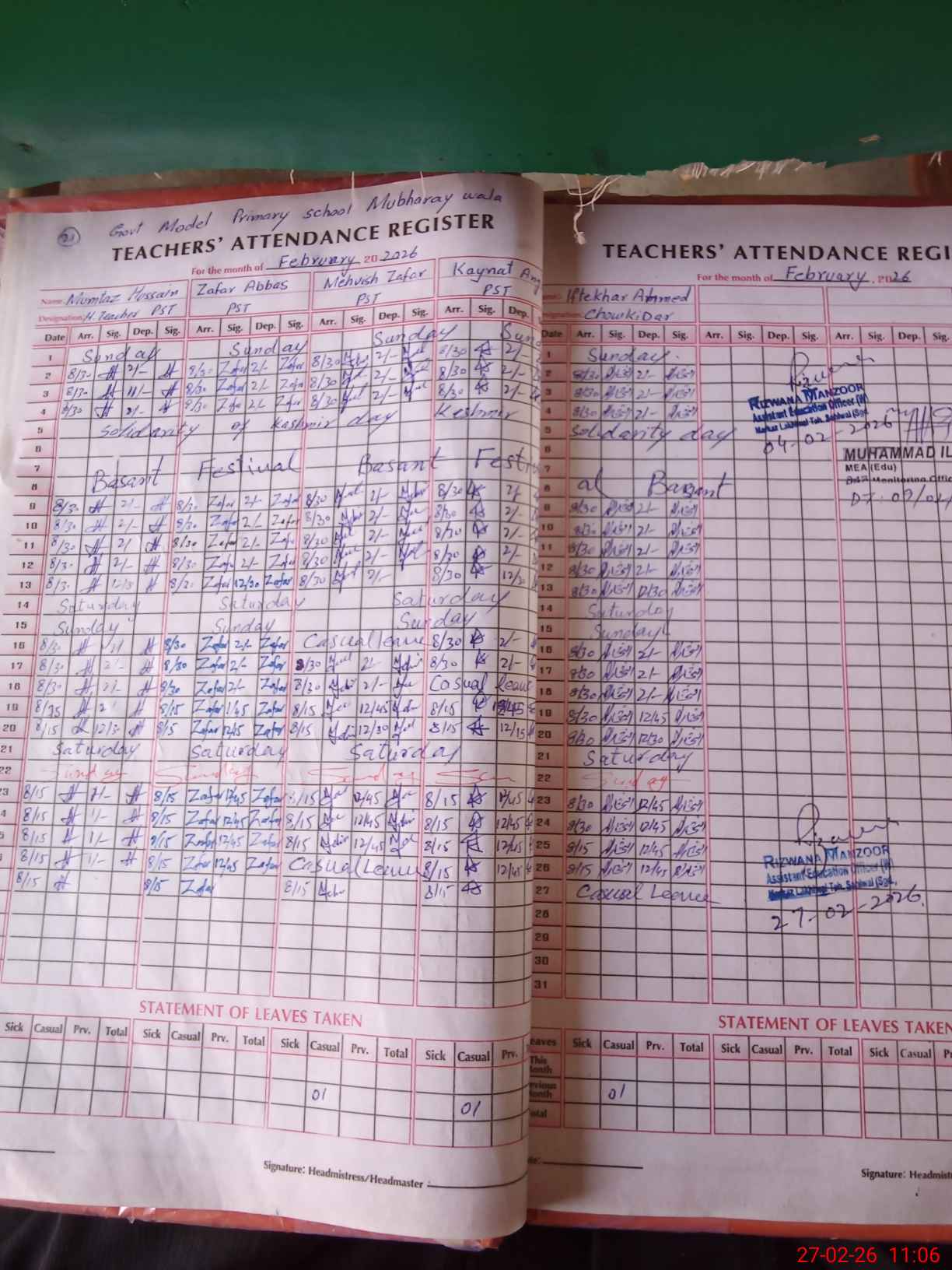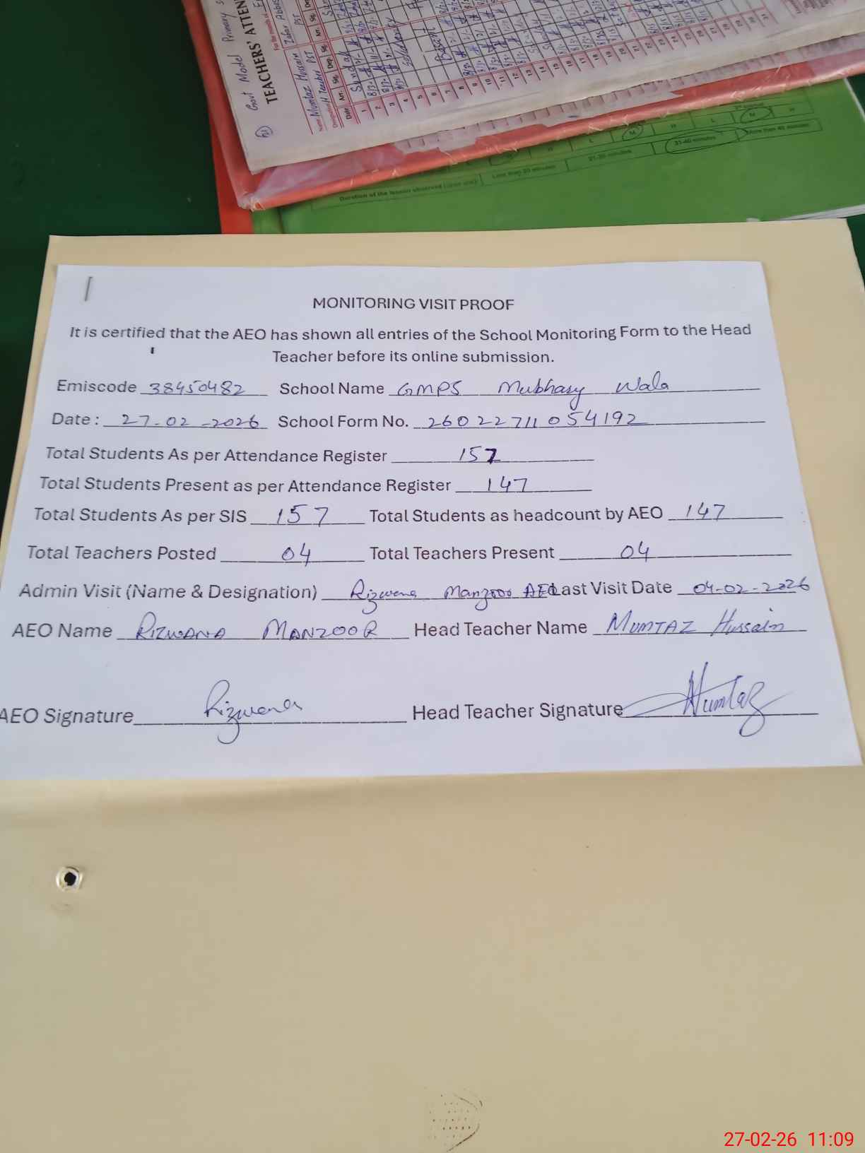 | Attendance Register | Head Teacher | MEA with School | Visit Proof |