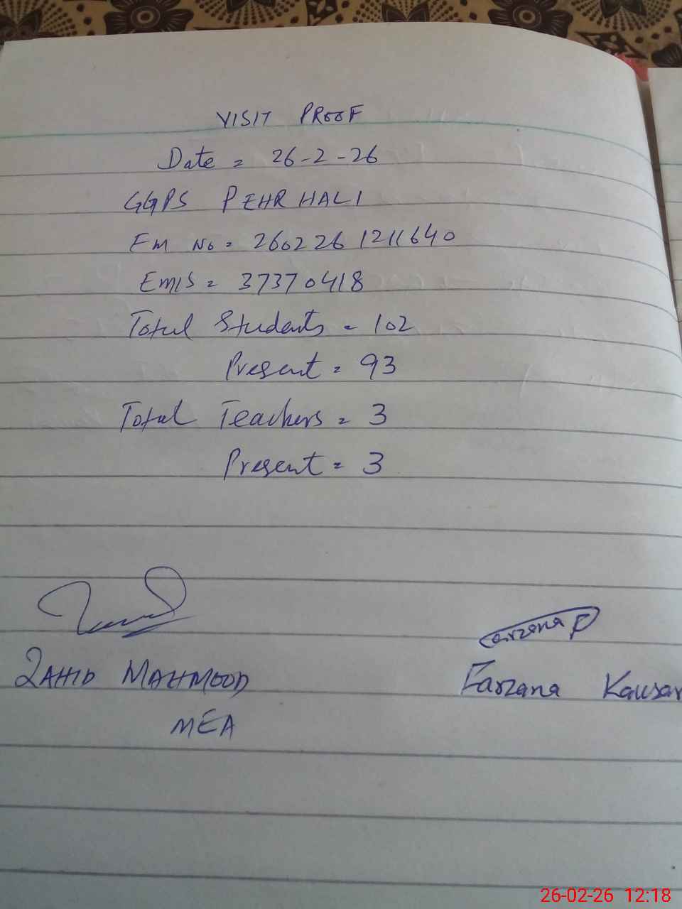 | Attendance Register | Head Teacher | MEA with School | Visit Proof |