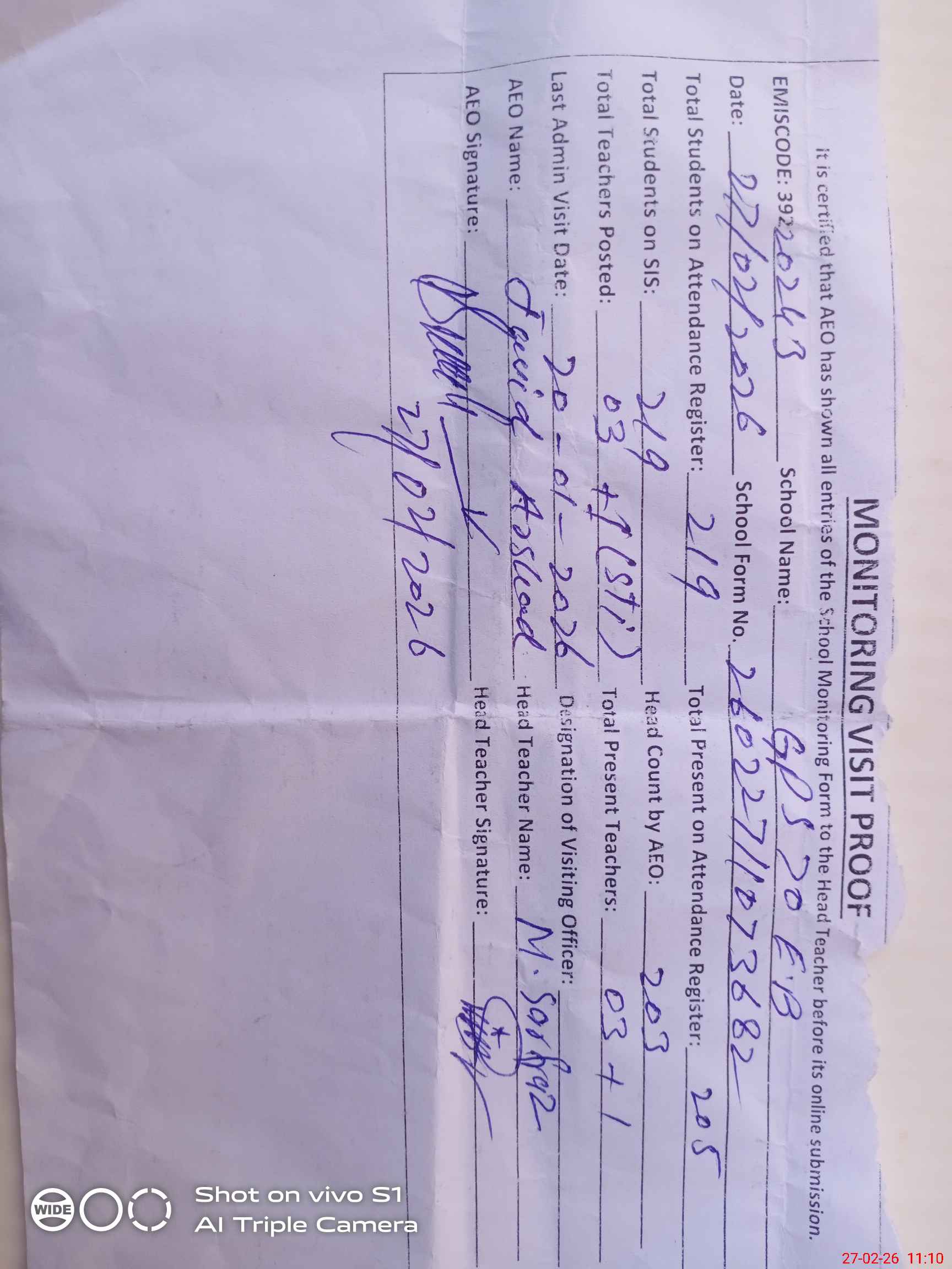 | Attendance Register | Head Teacher | MEA with School | Visit Proof |