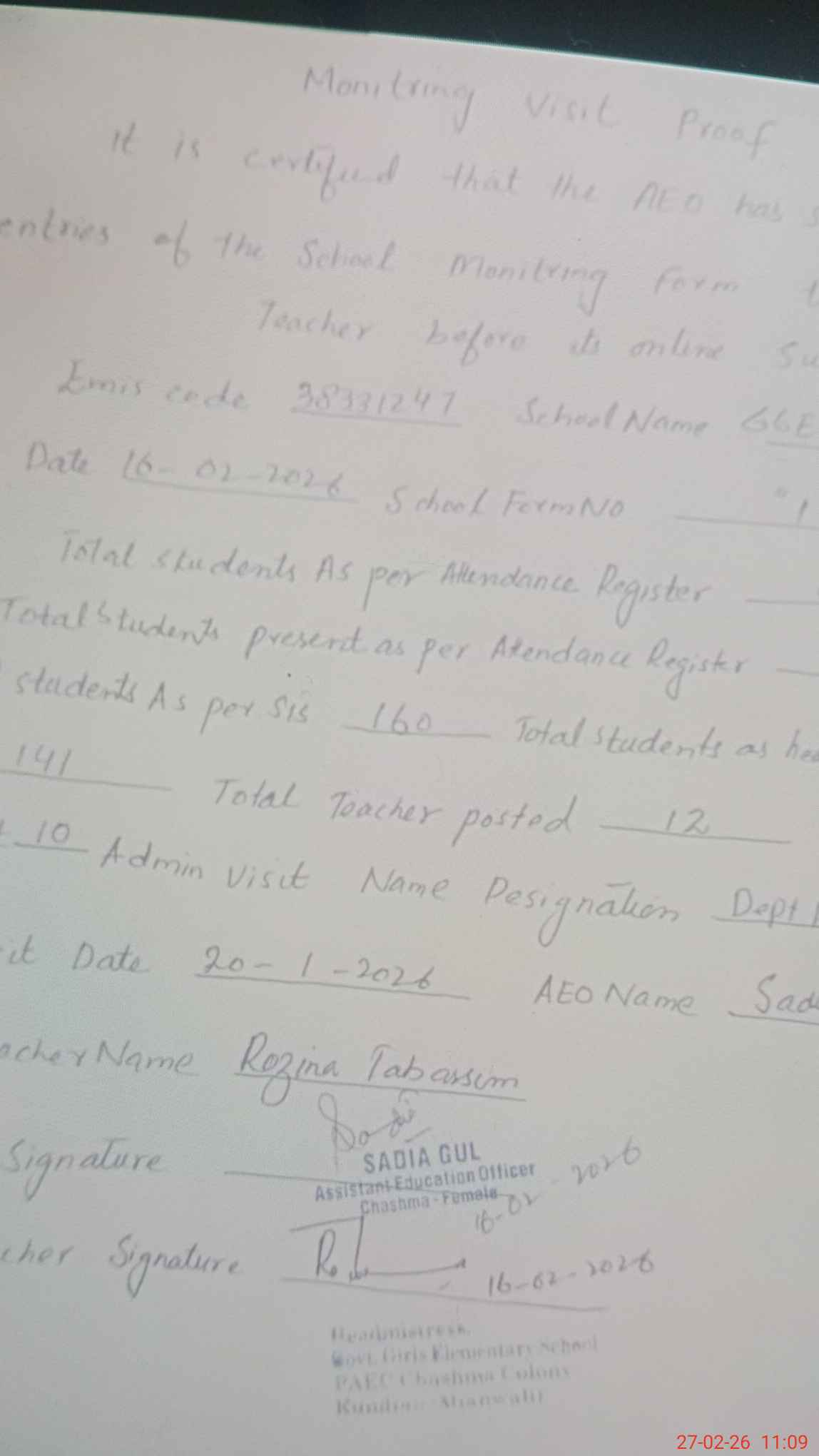 | Remarks (Use Separate Page if Required): school monitoring is done | |||||