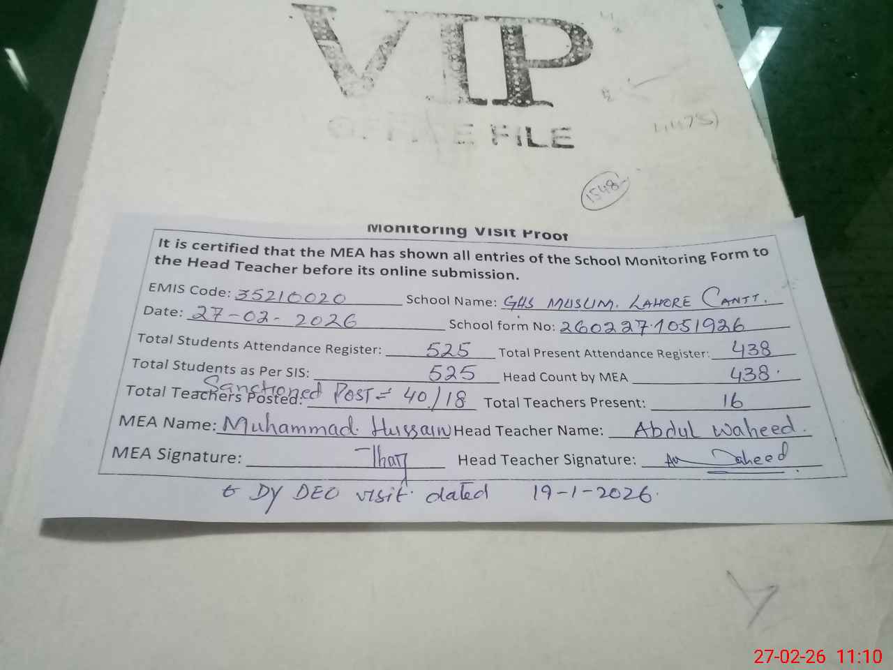 | EMIS Code: 35210020 | Name of School: GHS MUSLIM LAHORE CANTT | |||