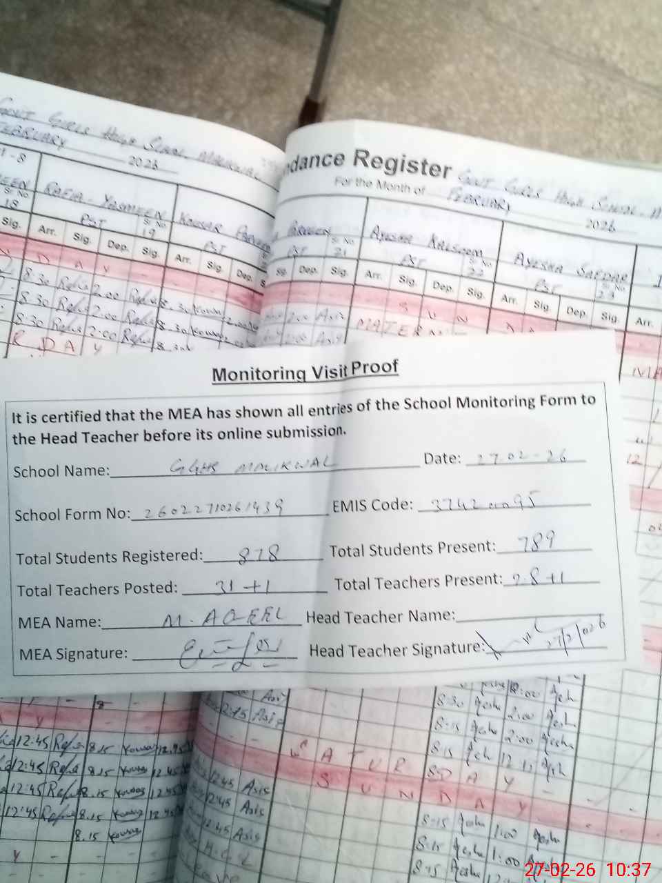 | Attendance Register | Head Teacher | MEA with School | Visit Proof |