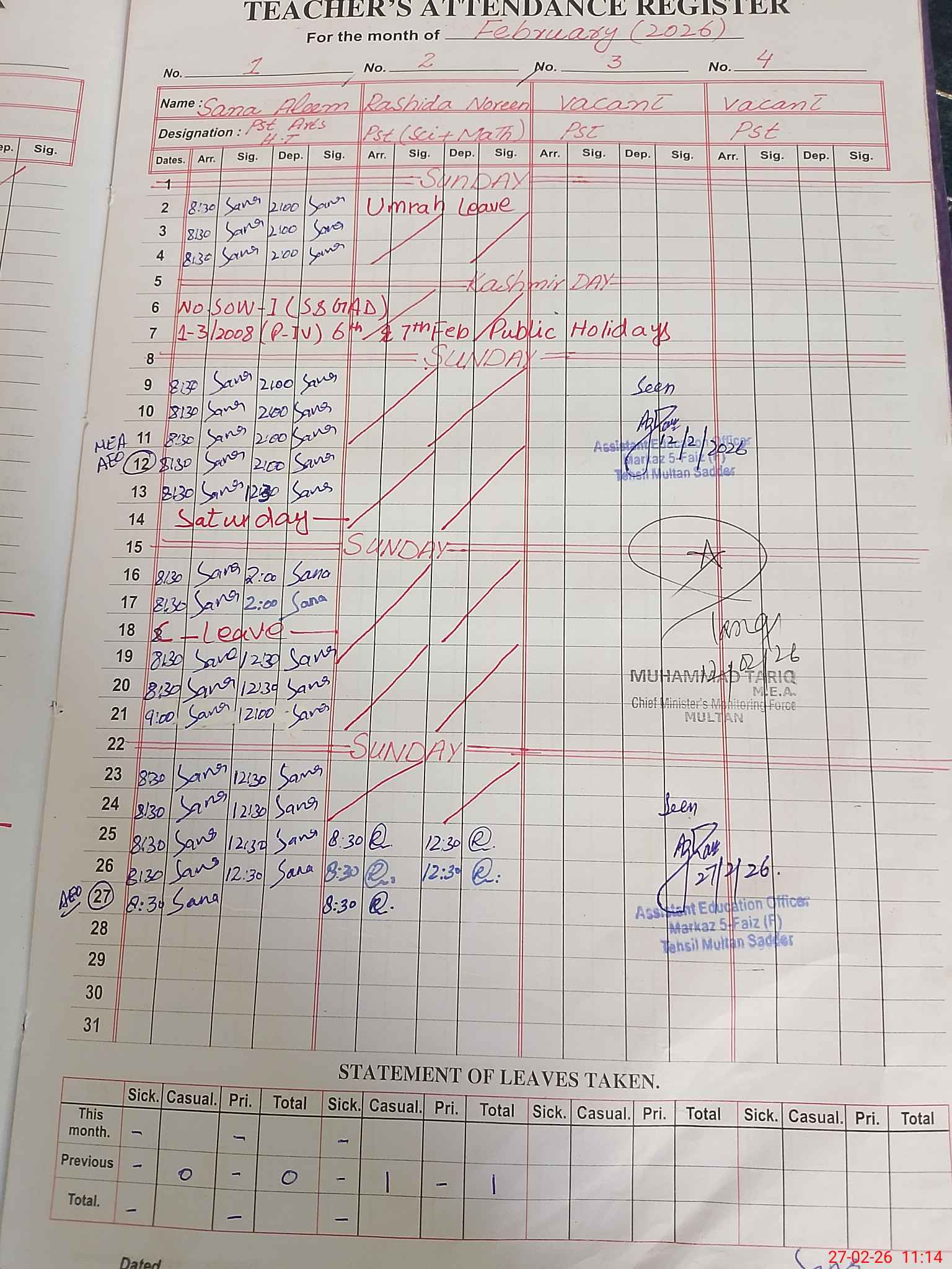 | Monitoring Date: 27-02-2026 | Start Time: 27-02-2026 10:41 AM | End Time: 27-02-2026 11:14 AM | Name of MEA: Az**** Ab**** | |
