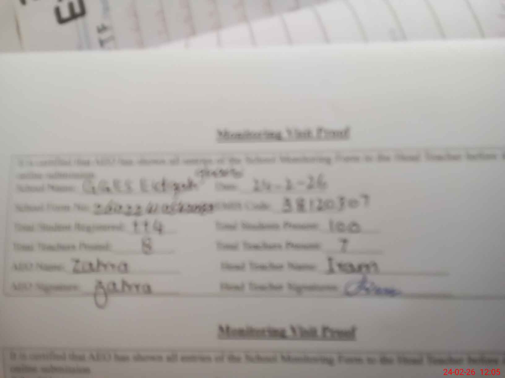| Monitoring Date: 24-02-2026 | Start Time: 24-02-2026 10:54 AM | End Time: 24-02-2026 12:06 PM | Name of MEA: Za**** Sa**** | |