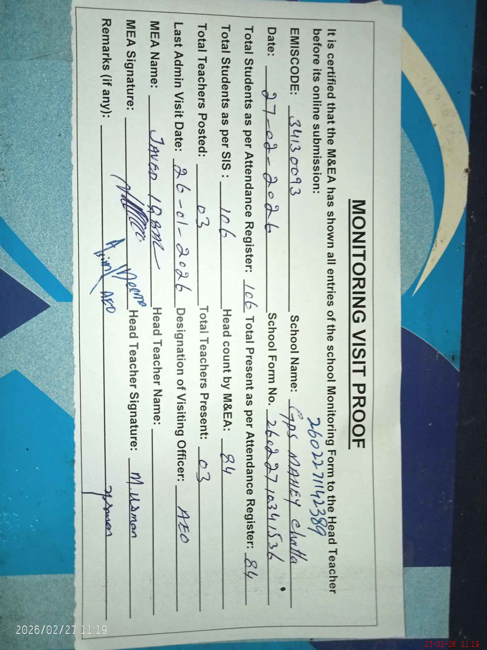 | Attendance Register | Head Teacher | MEA with School | Visit Proof |