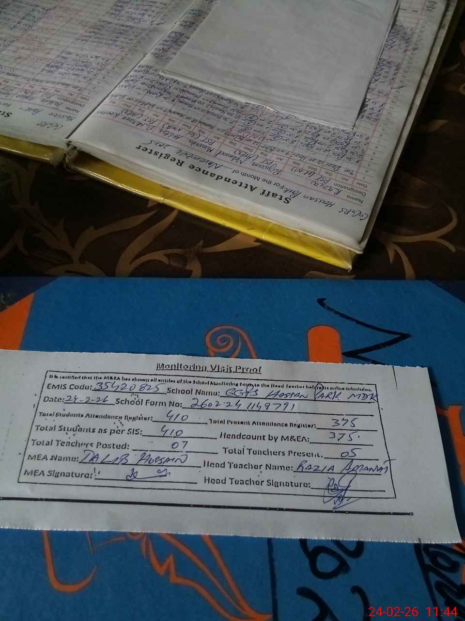 | Attendance Register | Head Teacher | MEA with School | Visit Proof |