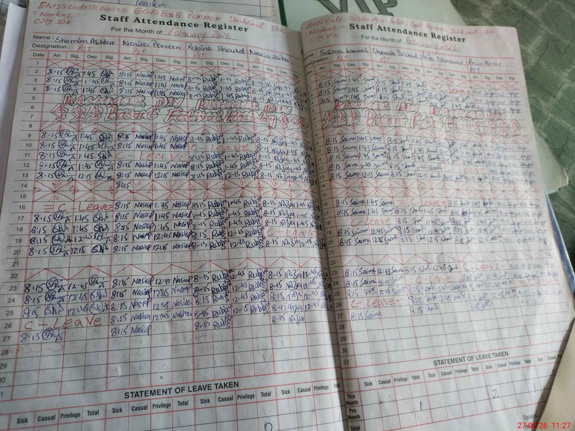| Leave | Duty | Absent | Maternity | Medical | Ex- Pak |