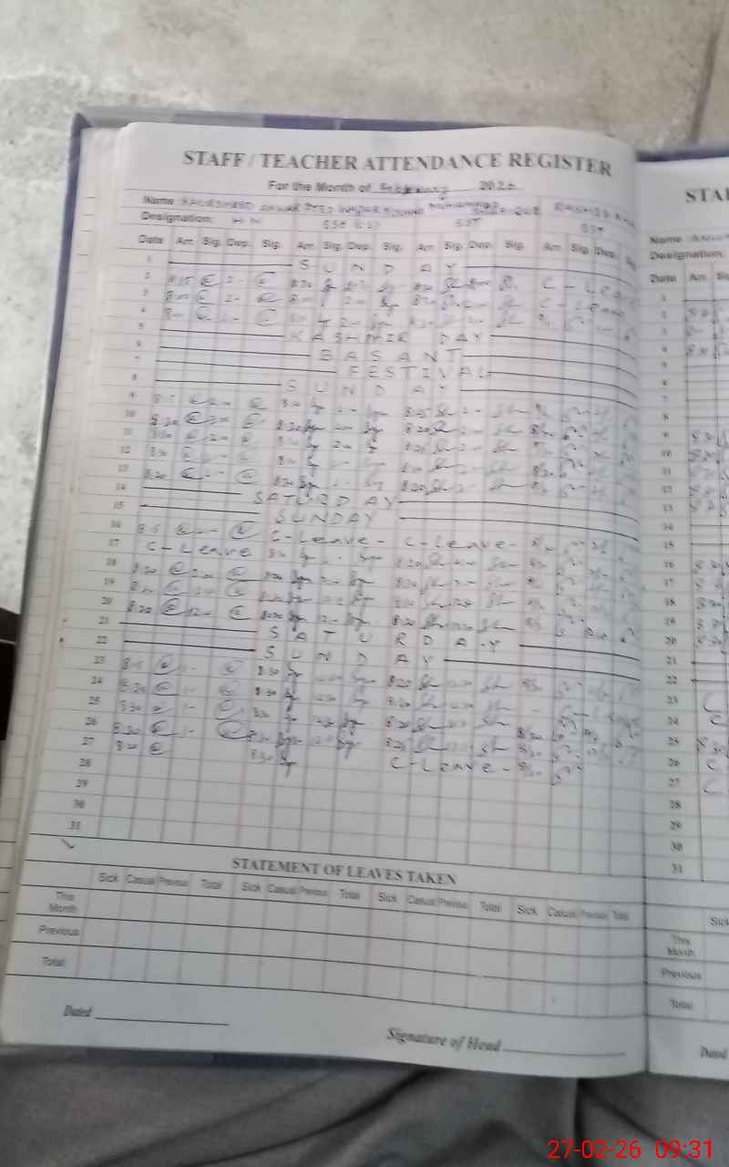 | Remarks (Use Separate Page if Required): Teacher Nighat PST with little baby in class room. NSB and FTF record not maintain properly method and not match with bank account statements. NSB record not available on SIS. Students present as per Roznamcha morning Shift 154 students but found 79 students after Head count, Difference found 75 Students. Students Inrollment as per Register 216 Students, Whereas On SIS 324 Students. | |||||
