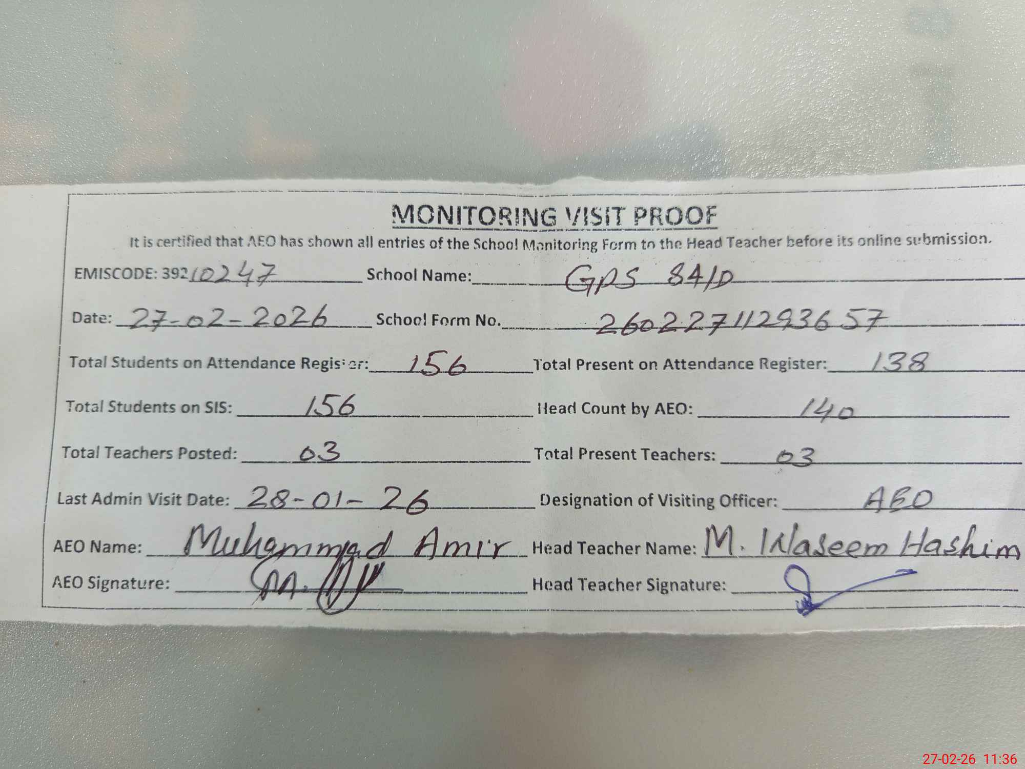 | Attendance Register | Head Teacher | MEA with School | Visit Proof |