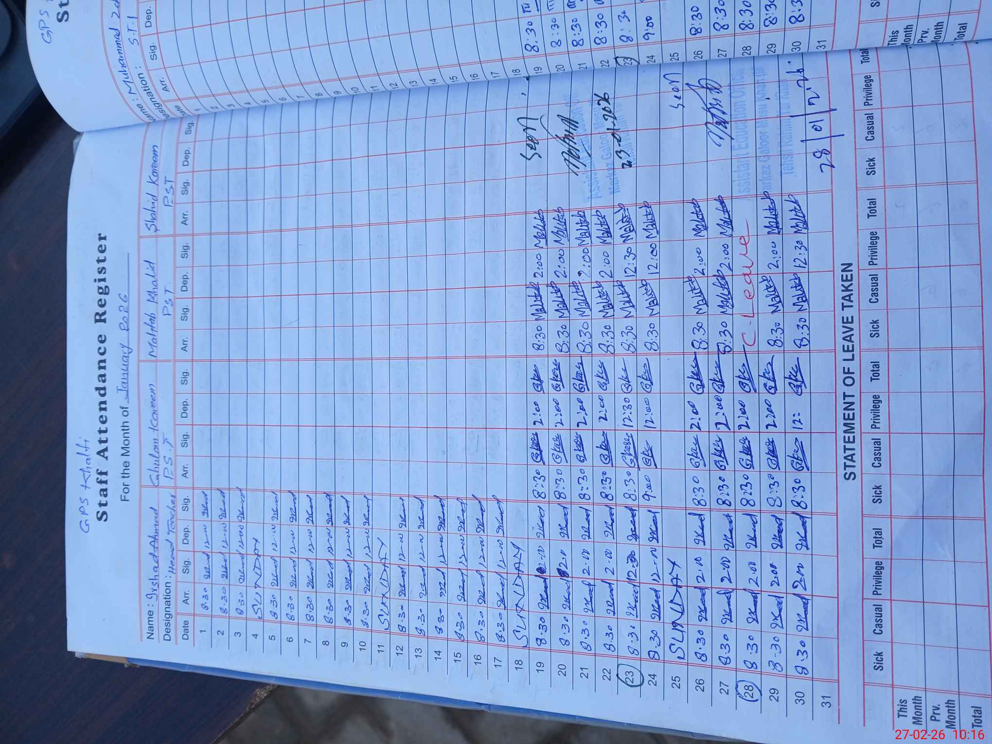 | Leave | Duty | Absent | Maternity | Medical | Ex- Pak |