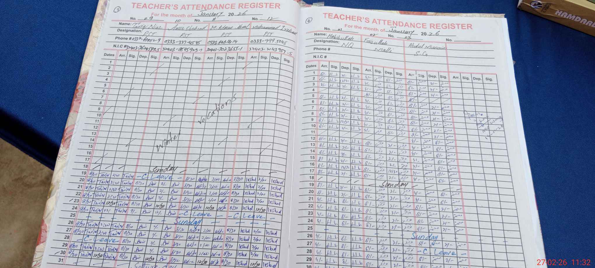 | CNIC | Full Name | Designation | R/C | Absence during last cal. month |