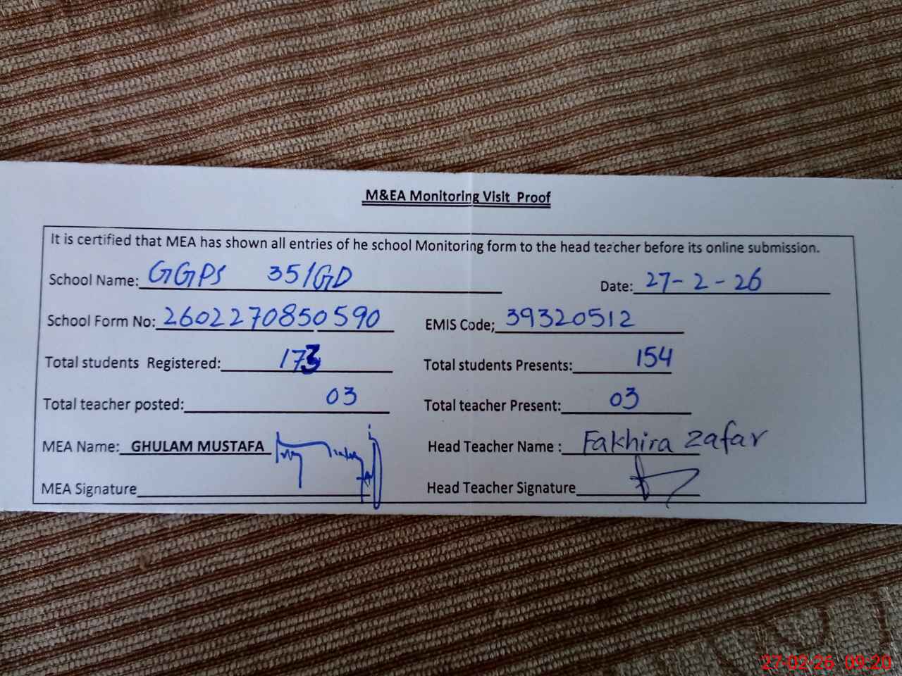 | Attendance Register | Head Teacher | MEA with School | Visit Proof |