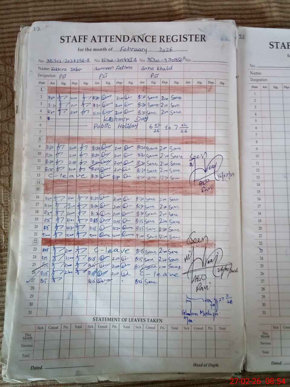 | Remarks (Use Separate Page if Required): Last Visit by AEO on 26 Feb, 26 Old building portion needs minor treatments and white wash etc | |||||
