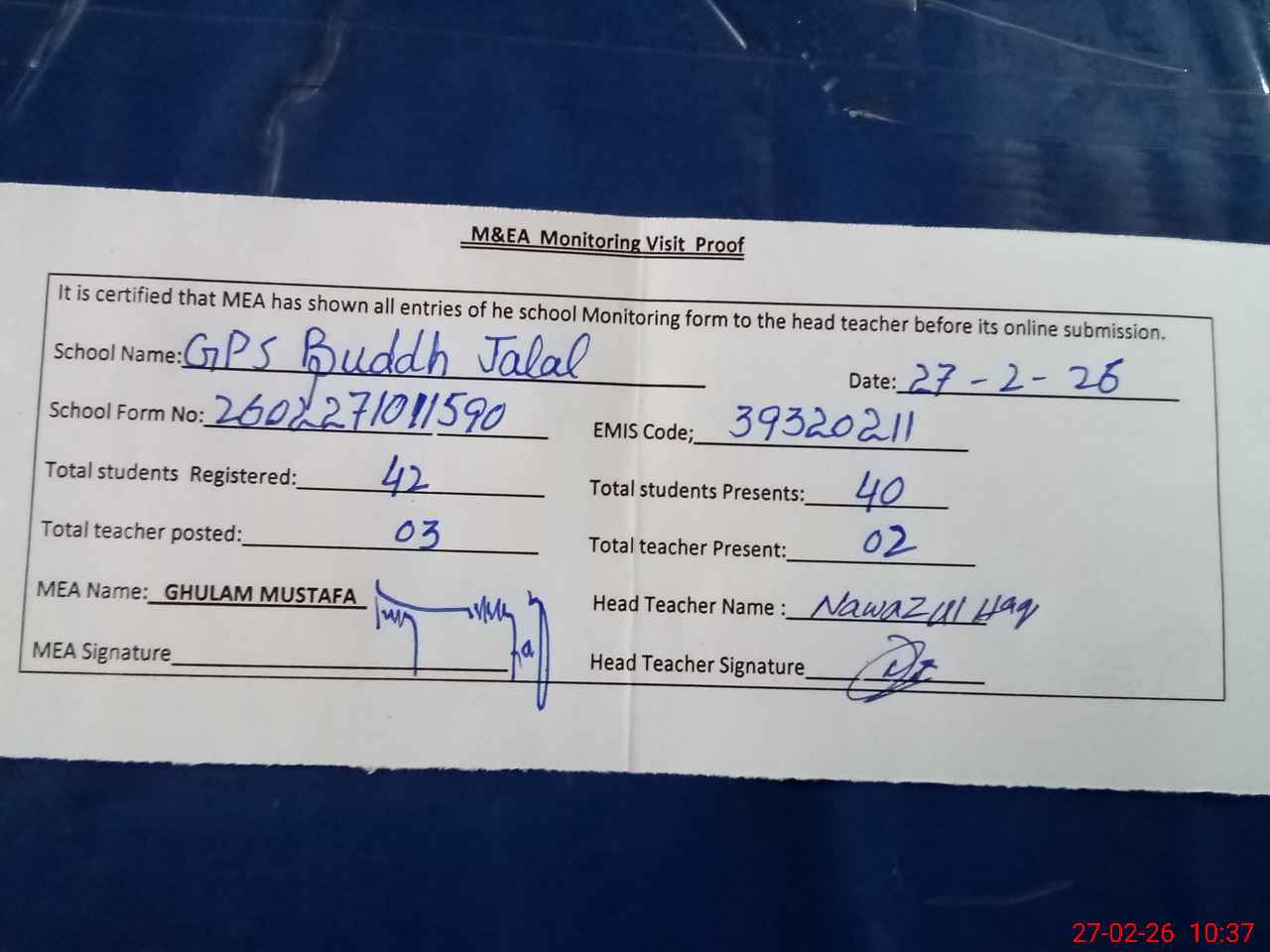 | EMIS Code: 39320211 | Name of School: GPS BUDDH JALAL | |||