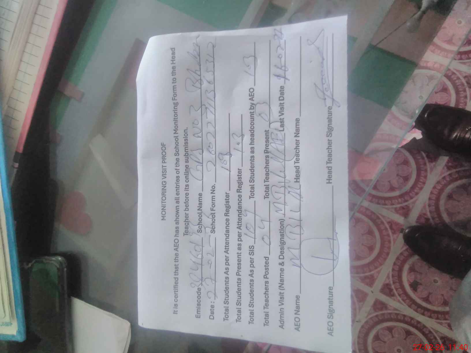 | Attendance Register | Head Teacher | MEA with School | Visit Proof |