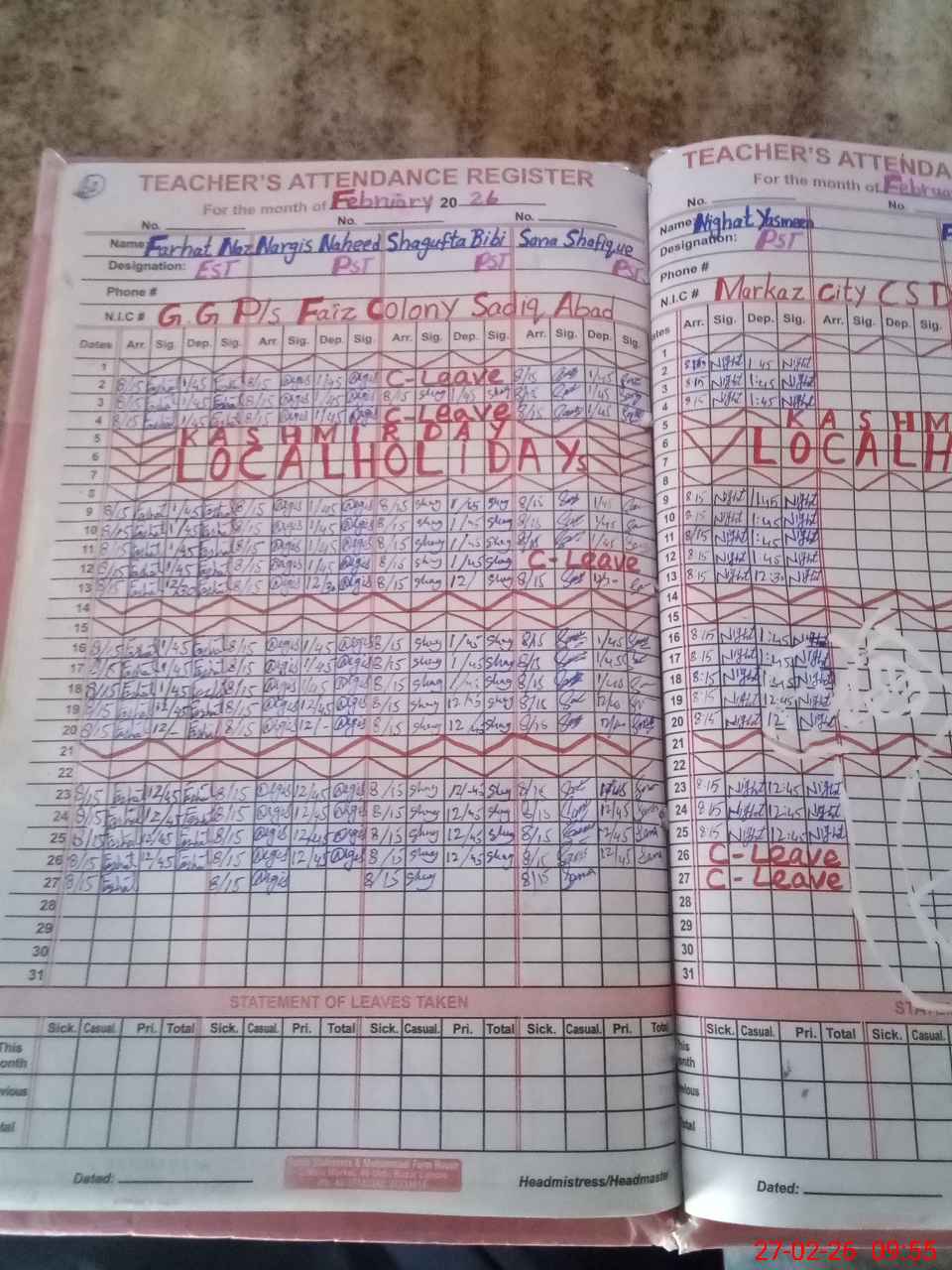 | Leave | Duty | Absent | Maternity | Medical | Ex- Pak |