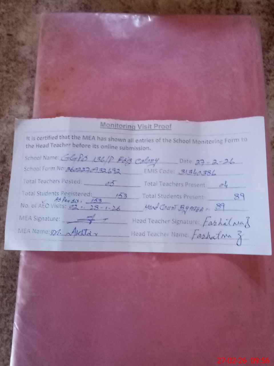 | Attendance Register | Head Teacher | MEA with School | Visit Proof |