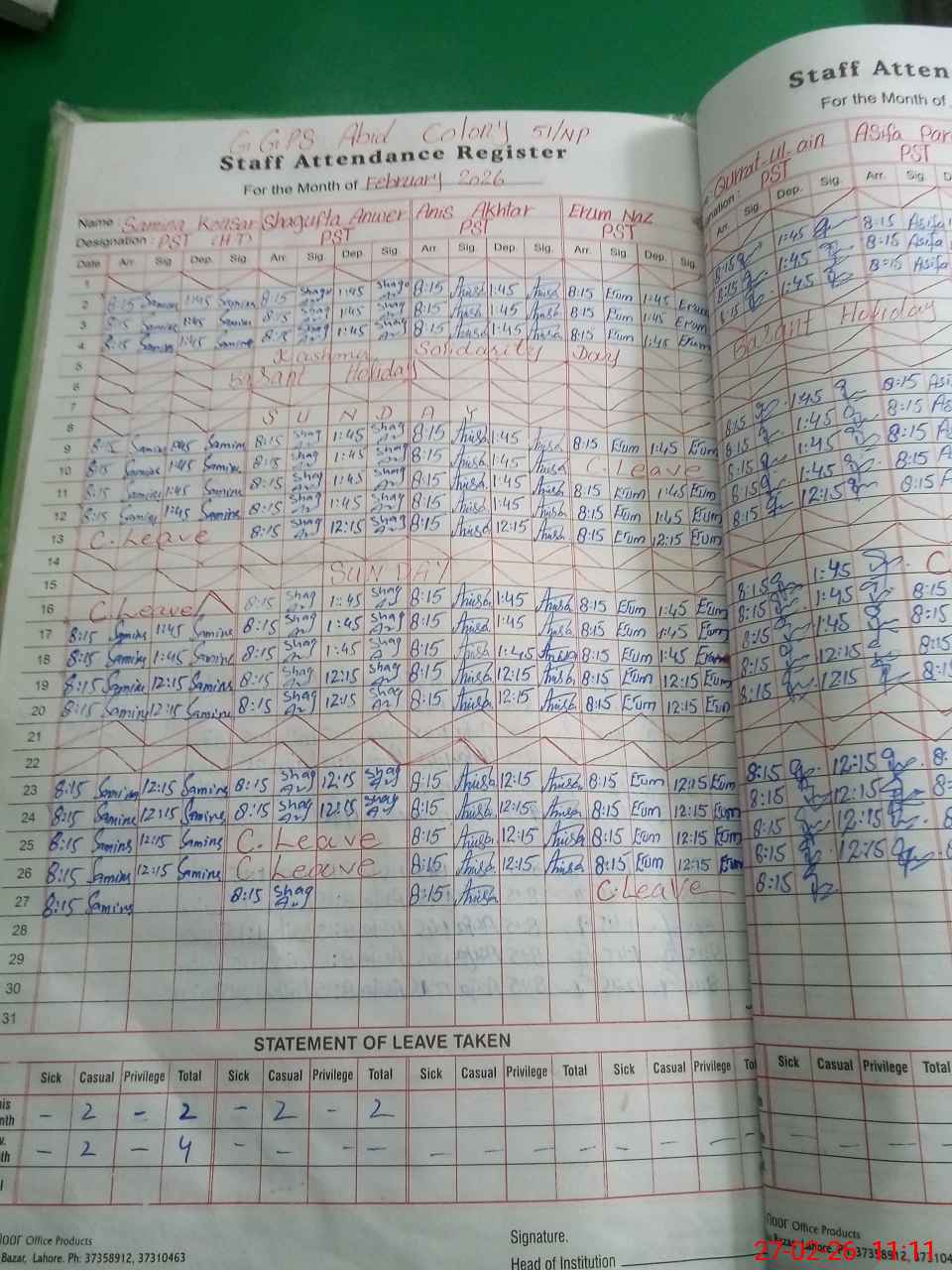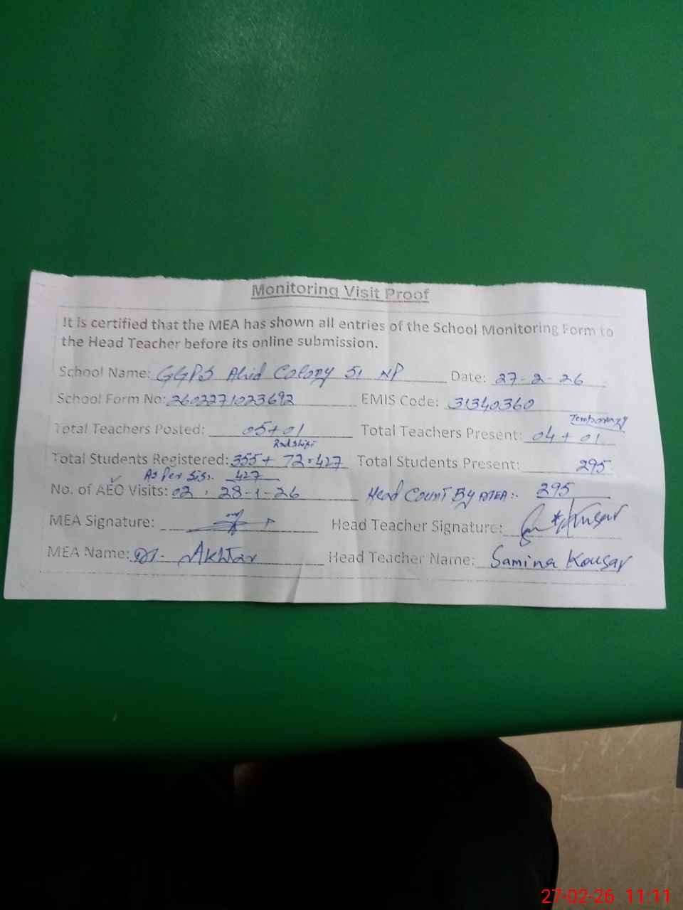 | EMIS Code: 31340360 | Name of School: GGPS ABID COLONY 51 NP | |||